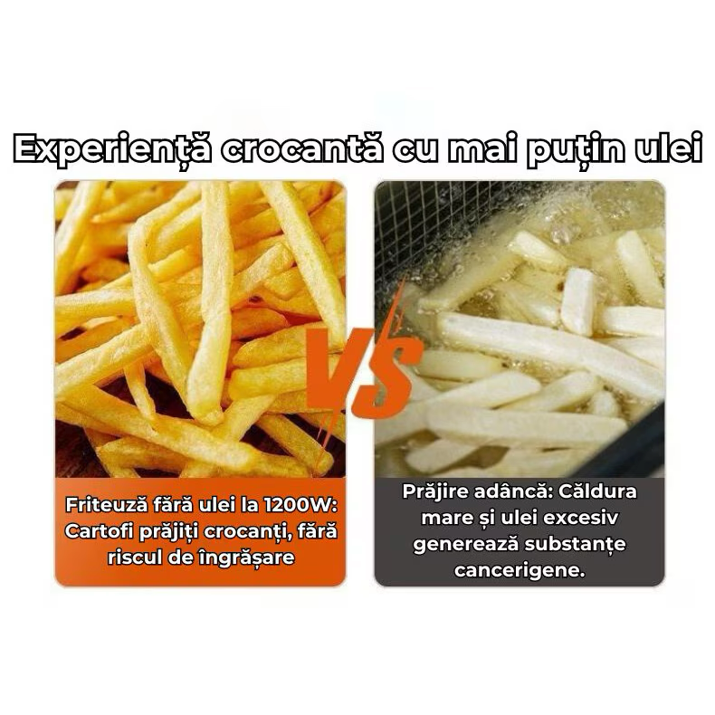 1. Gătire sănătoasă – Utilizează circulația rapidă a aerului cald, reducând necesarul de ulei și grăsimi. Rezultatul? Alimente crocante la exterior și fragede la interior, cu mai puține calorii.
