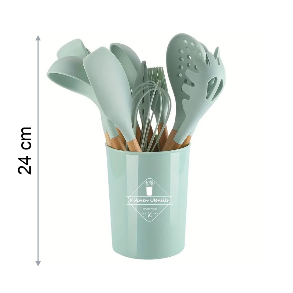 Setul include un suport pentru ustensile care ajuta la organizarea si depozitarea acestora. Astfel, ustensilele pot fi pastrate la indemana, pe blatul din bucatarie.