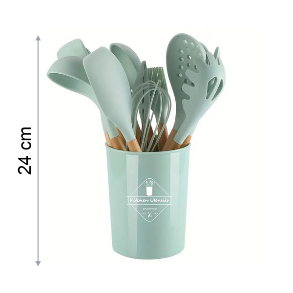 Set 12 Ustensile de Gatit din Silicon, cu Maner din Bambus