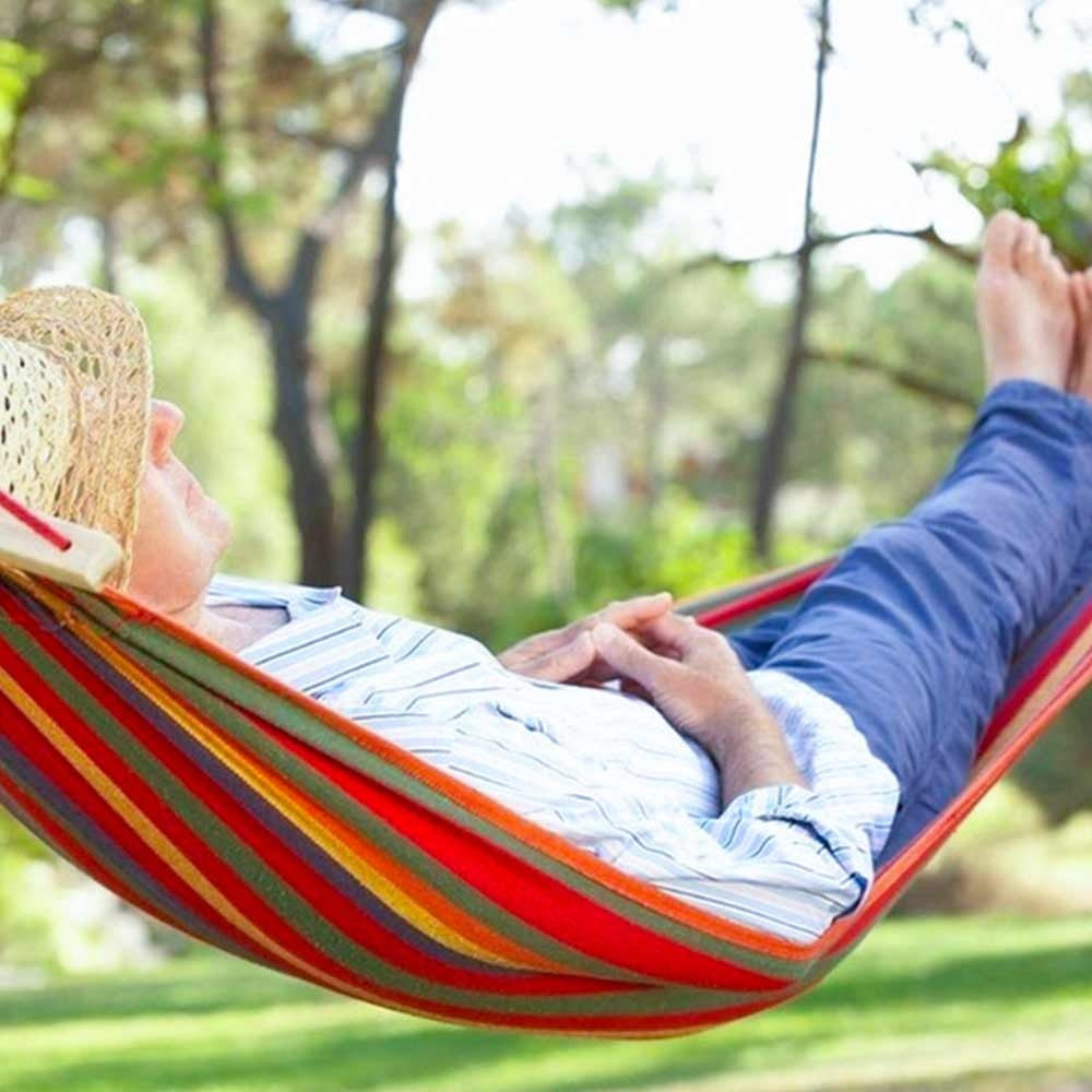 💤 Hamacul dublu din bumbac moale, cu bare de lemn pentru extra stabilitate, te îmbrățișează delicat și susține până la 200 kg. Este ideal pentru două persoane sau pentru un somn adânc sub cerul liber.