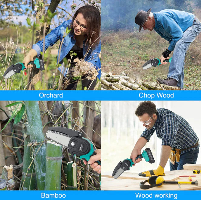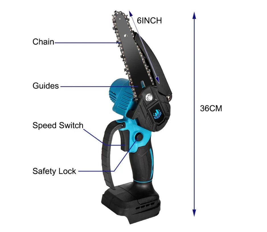 Mini drujba cu lant, fara fir, lama 6 inch, portabil , cu 2 acumulatori + 2 lanturi poate fi un instrument util pentru tăierea lemnului sau a altor materiale.