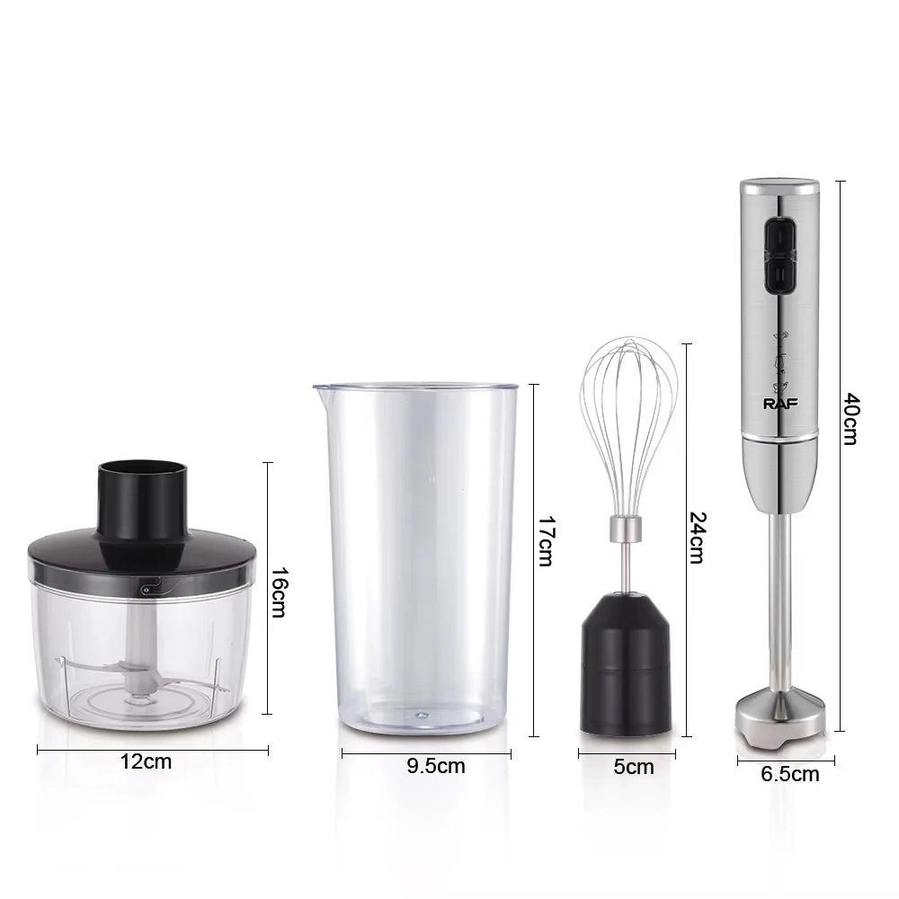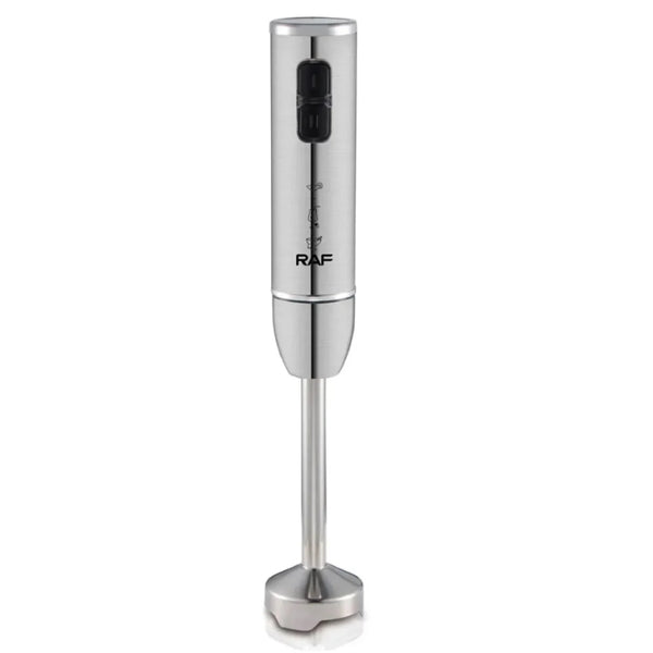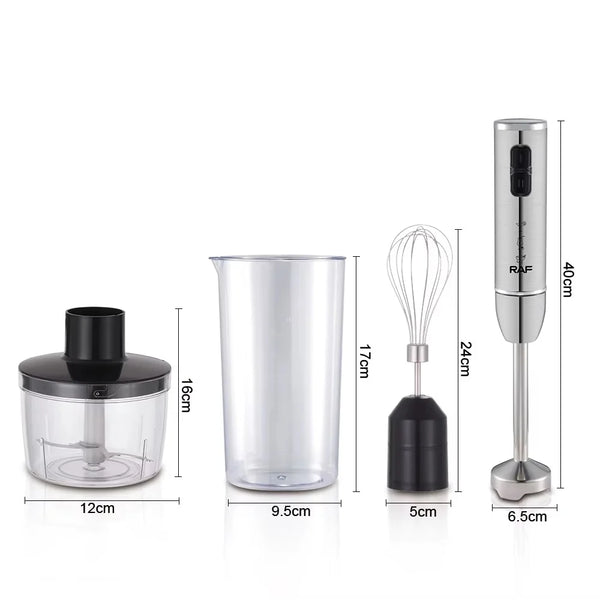 Descoperă versatilitatea în bucătărie cu blenderul vertical 4 în 1 RAF R3007. Putere de 1600W, lame din oțel inoxidabil, 2 viteze și accesorii esențiale pentru mixare, tocare și batere.