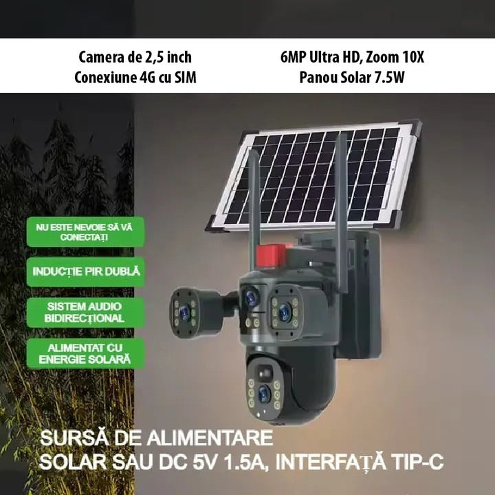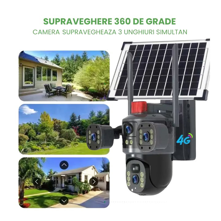 Transformati modul in care va protejati proprietatea cu Camera De Supraveghere 4G Tripla cu SIM, un dispozitiv inovator care combina tehnologia avansata, functionalitatea inteligenta si un design modern. Cu o capacitate de a inregistra din 3 unghiuri diferite simultan, aceasta camera este ideala pentru locuinte, spatii comerciale si locatii izolate.