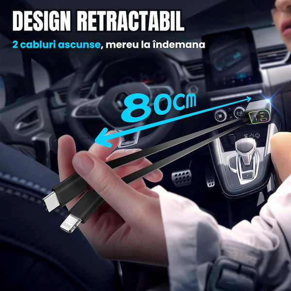 Spune adio dezordinii din mașină! Cele 2 cabluri încorporate sunt retractabile și ușor de folosit, oferind organizare și confort maxim.