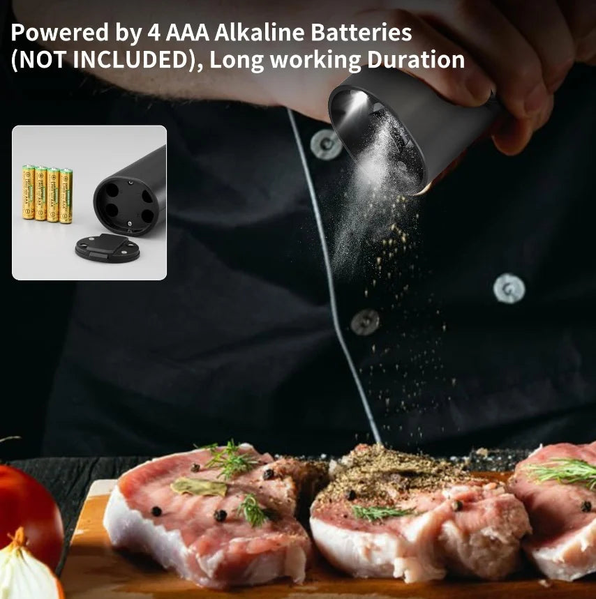 Operare automata cu o singura mana: Apasati butonul pentru a macina automat condimentele. Aceasta rasnita de sare si piper este mai convenabila decat cele traditionale si necesita mai putina munca. Alimentat cu baterii, fiecare tocator necesita 4 baterii AAA, bateriile neincluse.